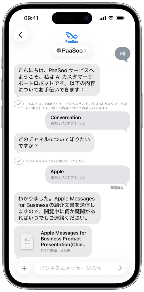 テキストだけのやり取りを超え、Apple の高機能なメッセージング機能を活用しましょう。リストピッカー、タイムピッカー、リッチリンクを使用してステップバイステップで顧客を案内し、問い合わせ、選択、決定までをすべてメッセージアプリ内で完結させます